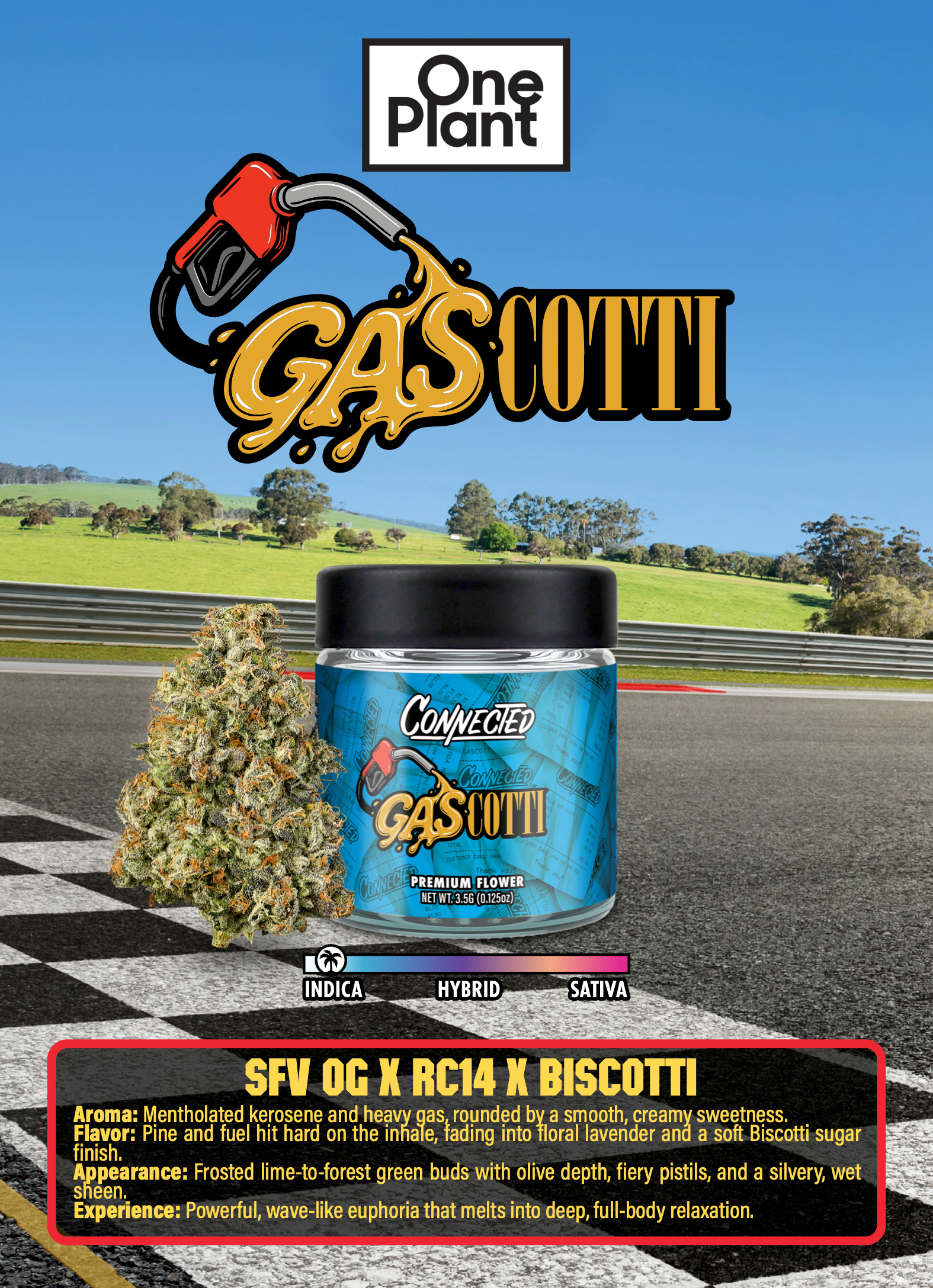 Gas Cotti is a heavy-hitting hybrid from Connected, blending SFV OG x RC14 x Biscotti into a terp profile that punches right out the jar. Expect that classic fuel-forward aroma—sharp, gassy, and slightly mentholated—balanced by a creamy sweetness that smooths everything out.